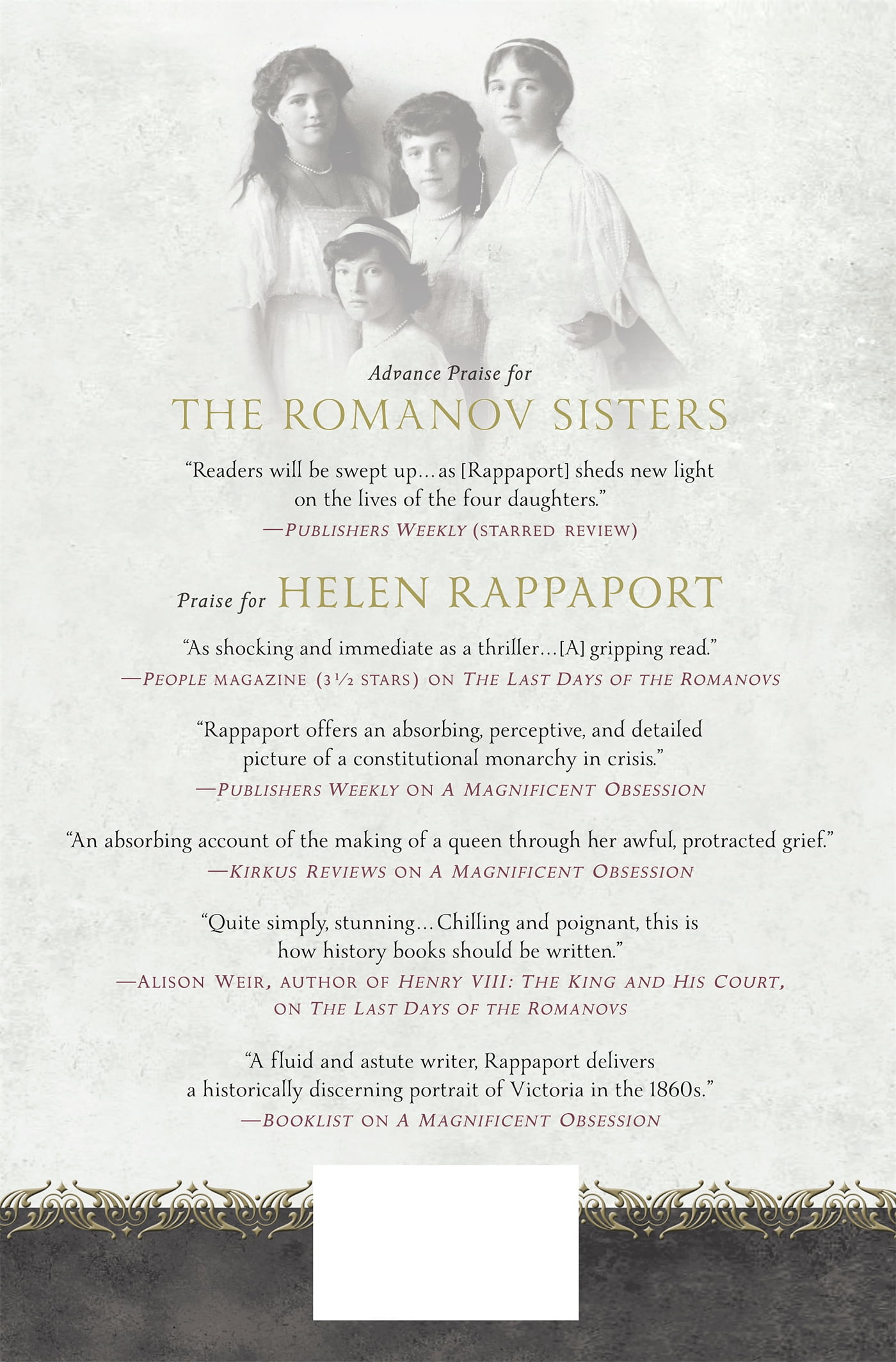The haunting cover photograph of the romanov sisters will draw readers, and the extensive bibliography will aid those who want to learn more. the title of this book could be more than you ever wanted to know about the romanov sisters.