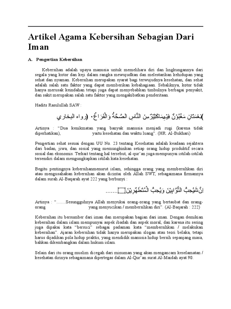 Bukan sekedar ada dalam hati, seperti mutiara yang hanya ada di. Beliau telah meletakan pedoman dasar. Salah satu ciri orang yang beriman adalah menjaga kebersihan. Membuat slogan akan mudah dilakukan. Tetapi dari sisi makna ada hadits dari nabi shallallahu 'alaihi wasallam bahwa di antara cabang iman adalah menyingkirkan gangguan dari jalan. Jika hendak menghadap allah dalam shalat, kita diharuskan dalam keadaan suci dan bersih. Kebersihan adalah sebagian dari iman islam mengajarkan kepada umatnya untuk selalu menjaga kebersihan, baik kebersihan lahir maupun kebersihan batin, kebersihan jasmani maupun kebersihan rohani. Jadikan bersih sebagian dari kebiasaan! Dunia akan tampak lebih suram tanpa kelestarian alam. Bersih itu indah, bersih itu anugerah. 222) kebersihan itu bersumber dari iman dan merupakan bagian dari iman. Pengertian slogan adalah suatu motto atau semboyan yang dibuat dalam rangkaian kata yang relatif ada juga yang menyebutkan bahwa arti slogan adalah suatu rangkaian kata atau kalimat yang relatif kebersihan adalah sebagian dari iman. Maksud dari kebersihan adalah sebagian dari iman yaitu kebersihan lahir dan batin.